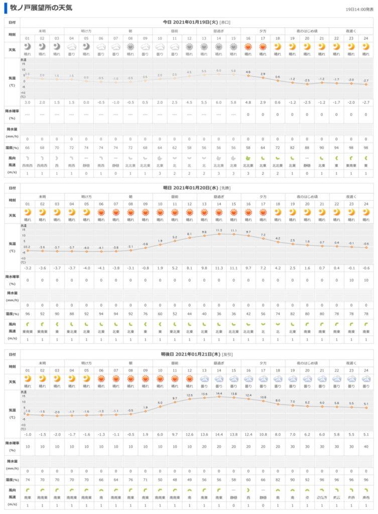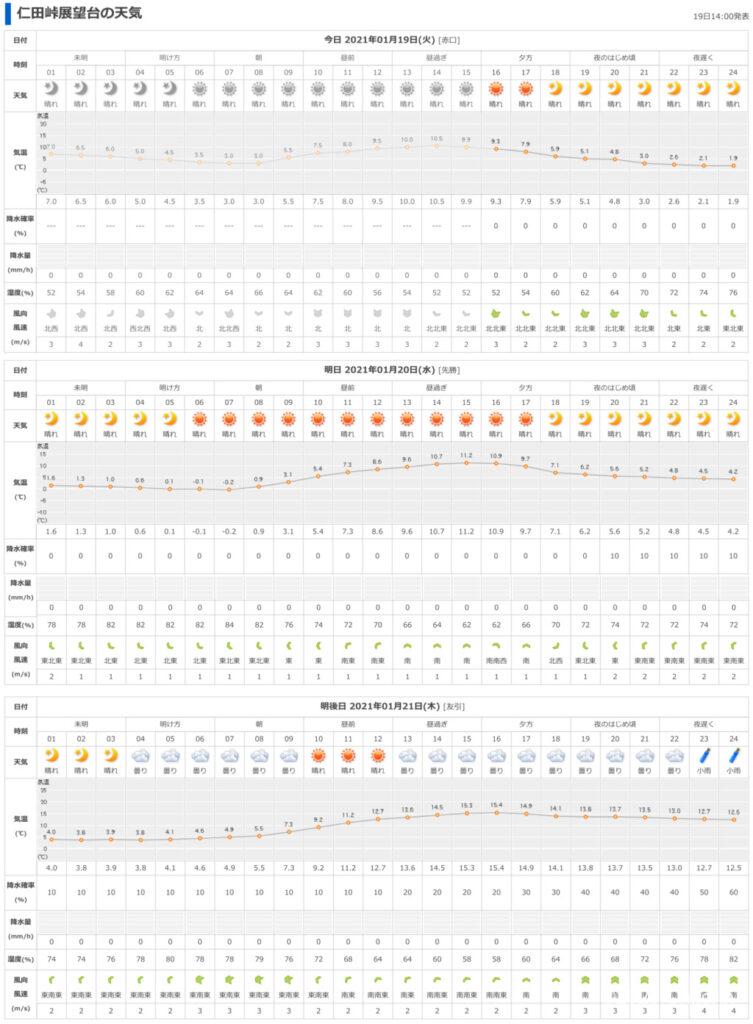 20日の明け方にマイナス4℃まで下がる。しかも湿度は90%ほどある。風が微風…。できたらもっと低温多湿で強めの風であって欲しいのだが…。霧氷が出る可能性はかなり0に近いが、0ではない! のではないか…と勝手な解釈。